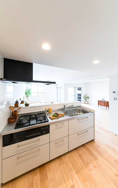 ダイニングもリビングも見渡せるキッチンに立ち、宿題をする子どもたちの様子を見守りながら夕食の準備を整えたり、休日の朝は、家族そろってゆっくり朝ごはん。 窓から差し込む光が、無垢の床をやわらかく照らし、 「今日はどこに行こうか」と自然と会話が弾む ──そんな時間が流れます。
