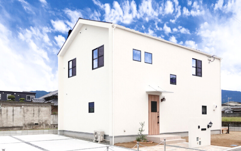 三角屋根がかわいいバルコニー付きの2階建て。バルコニーでもCafeができるようなゆったりとしたスペースです。テーブルとイスを置いてCafeタイムやポップアップテントを出してお家で手軽にベランピングも楽しめます。