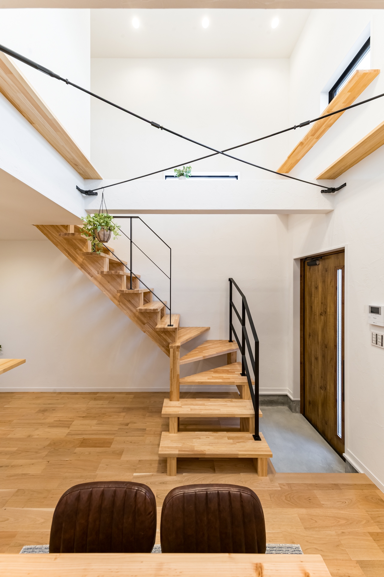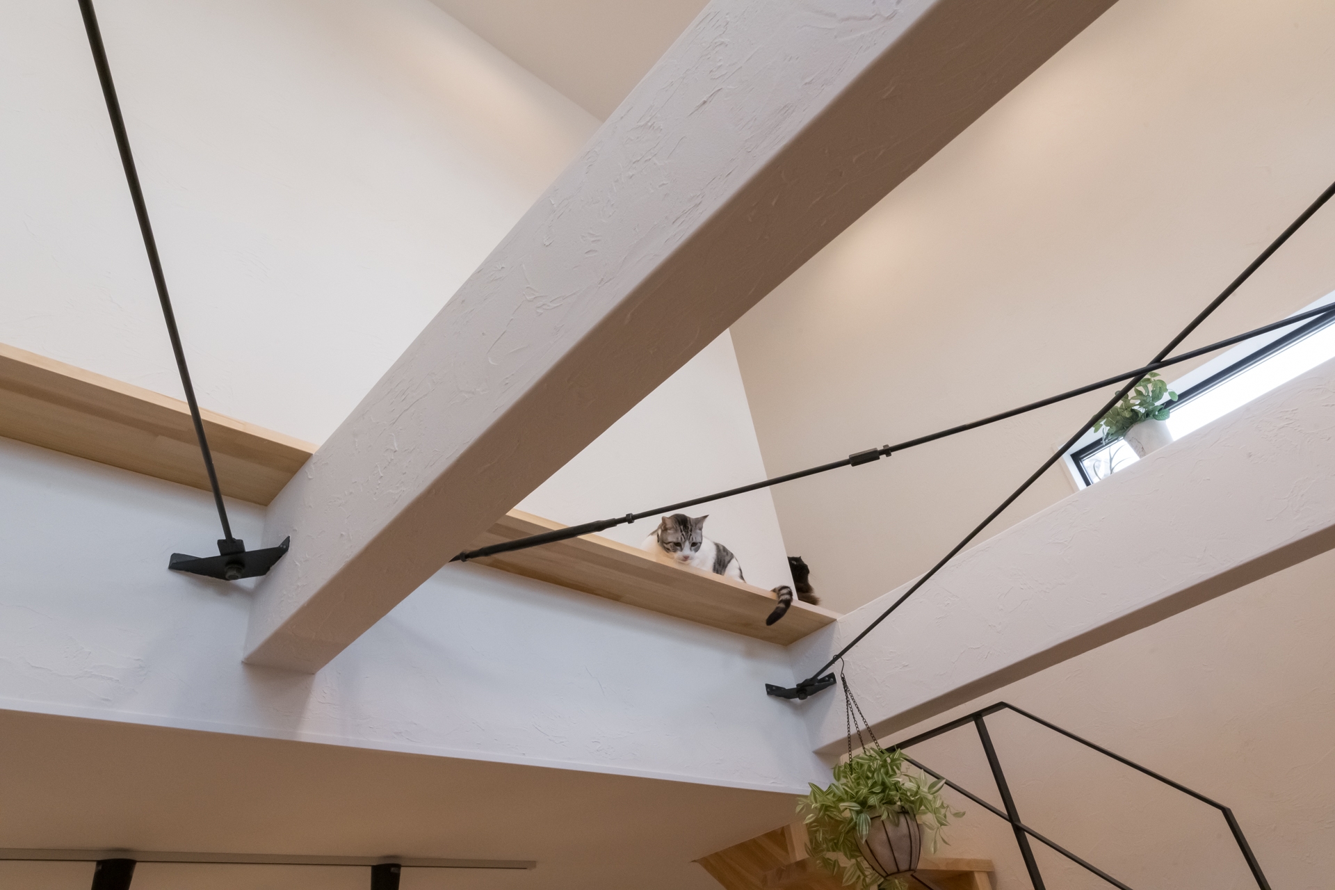玄関を入ってすぐにオープン階段がお出迎え。リビング上の吹き抜けにはキャットウォークがあり、ねこ様たちの姿をいつでも感じられます。